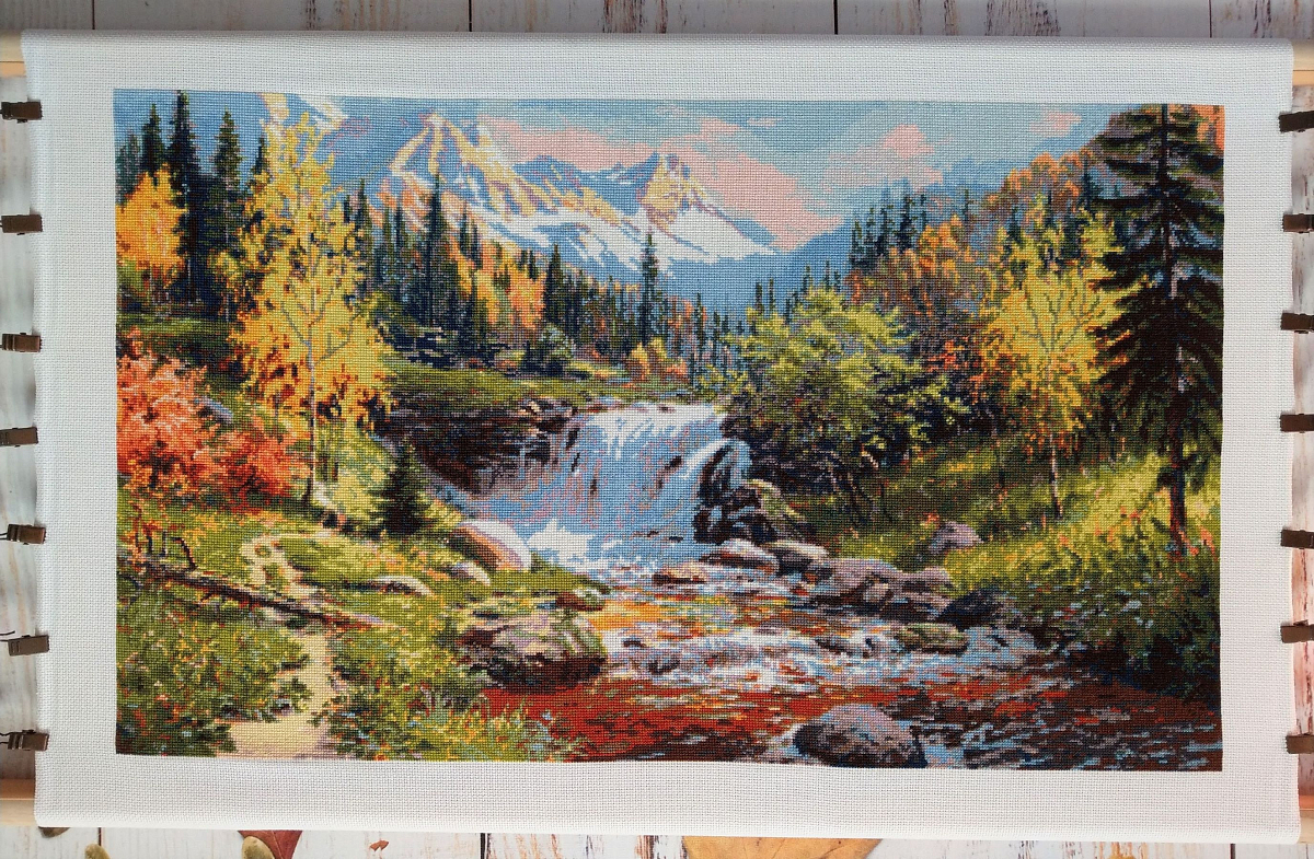 Все хорошо, нитки с хорошим запасом все. По схеме: мешанина есть, но вышивается вполне комфортно, без одиночек. Меня устроила проработка дизайна и березы вполне узнаваемы. Были нюансы с эл. схемой, но все решилось, перешивать спорный участок не стала))) Размер готовой работы после стирки 33 * 55 см